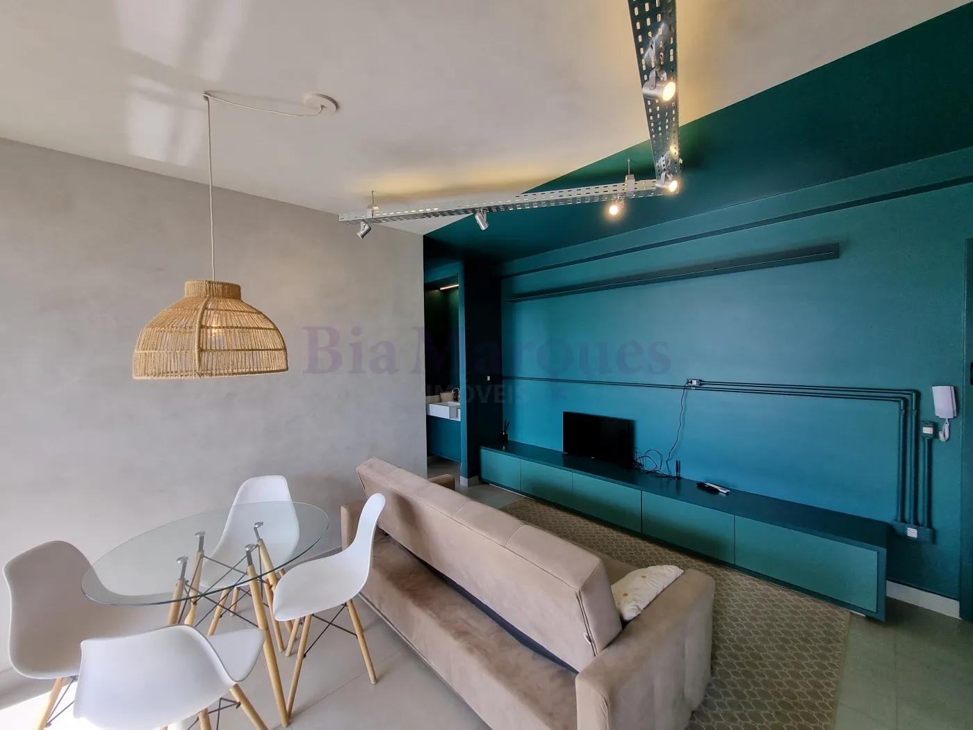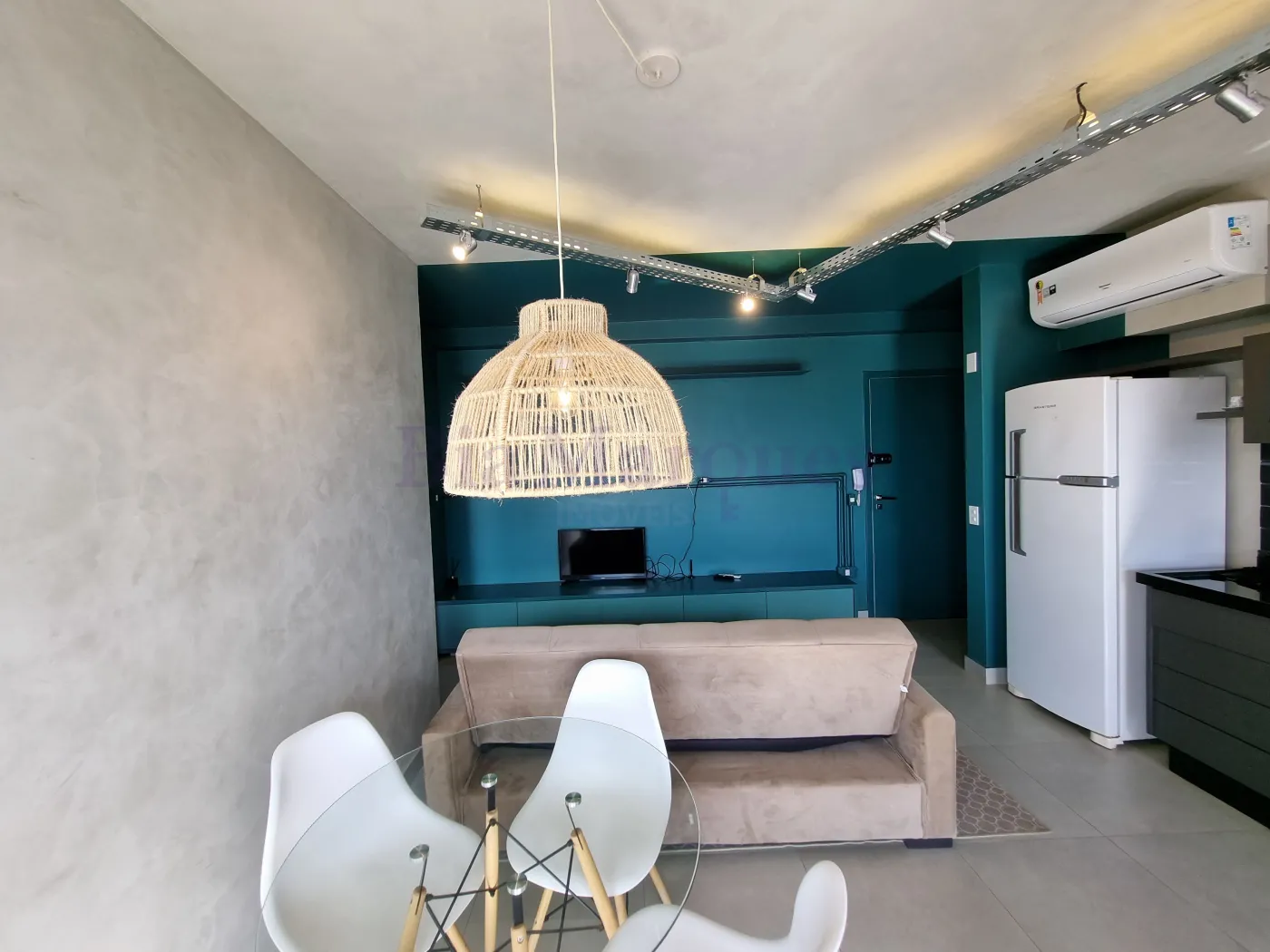 - sala de estar com mesa, painel, sofá e ar condicionado