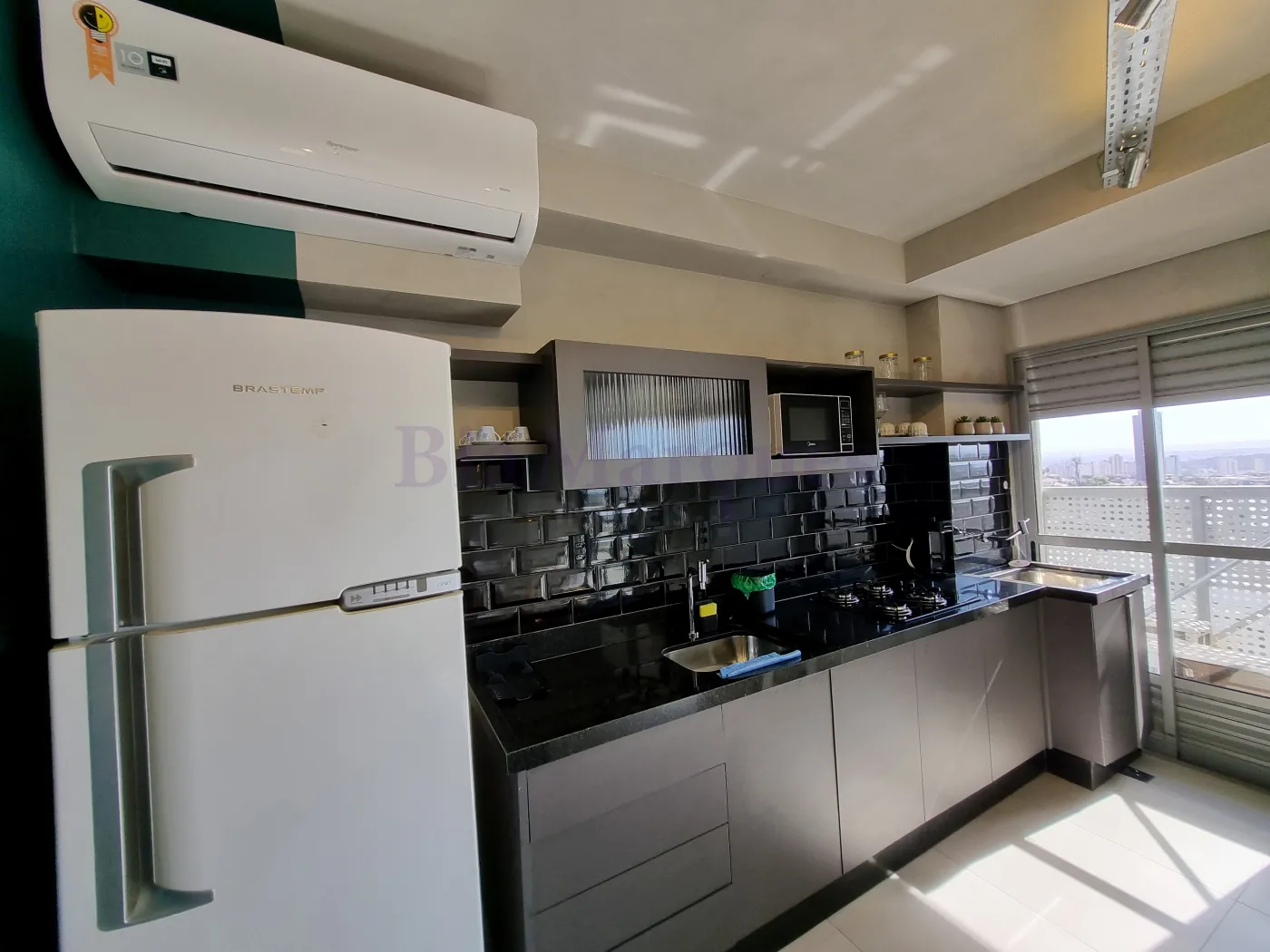 - cozinha com cooktop, geladeira, liquidificador, air fryer, e micro-ondas