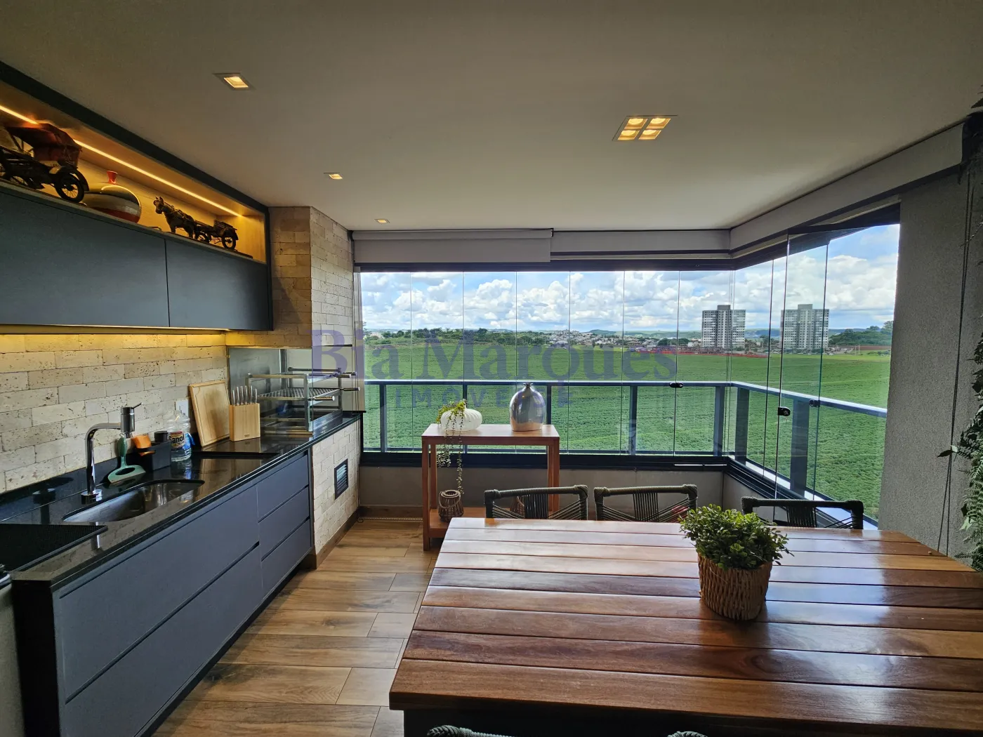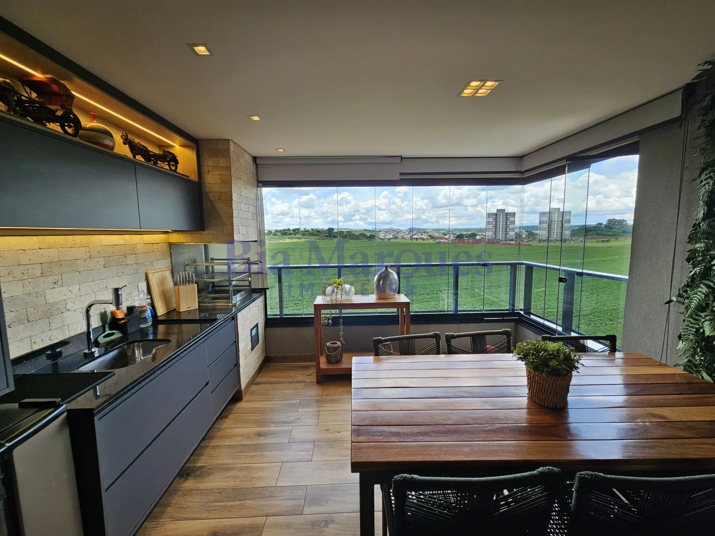 *varanda gourmet fechada com blindex, com churrasqueira a carvão