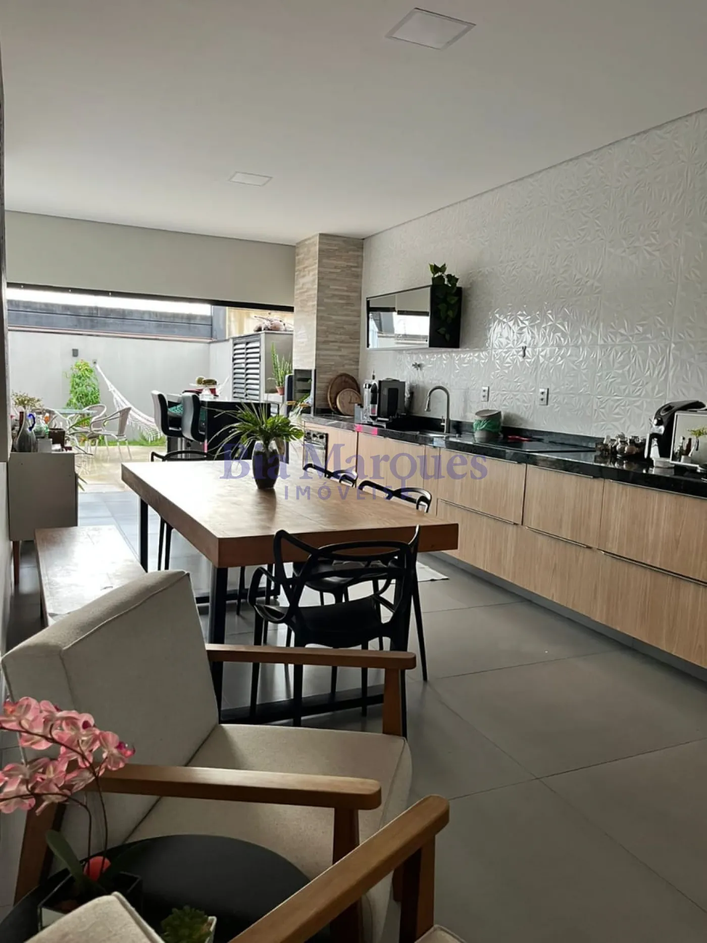 Cozinha planejada integrada à área gourmet com churrasqueira