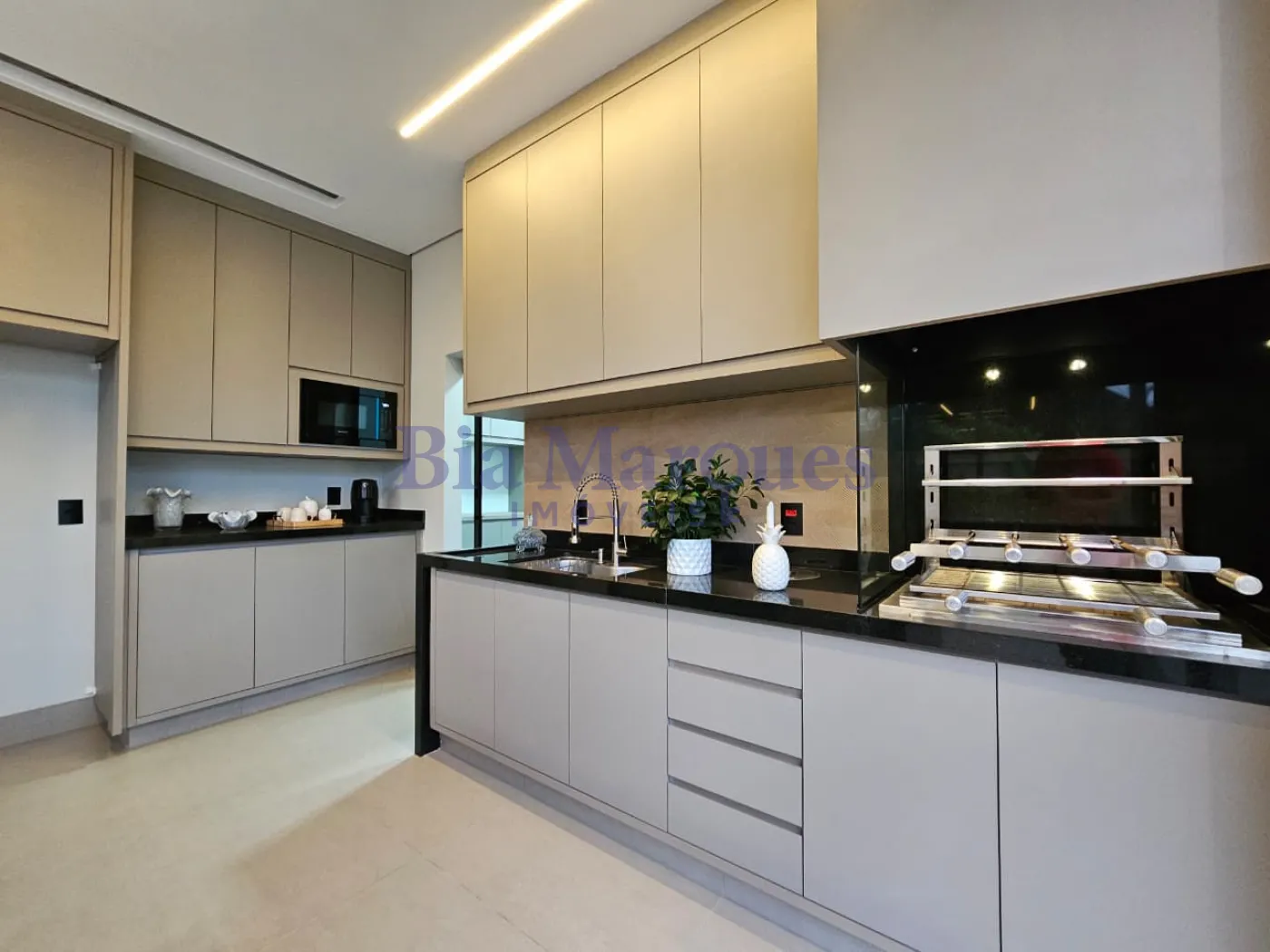 - Cozinha ampla, com micro-ondas, forno Elétrico, cooktop, coifa, cafeteira e churrasqueira;