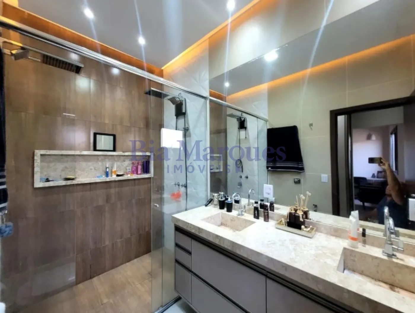 - O banheiro da suíte máster conta com pia dupla e dois chuveiros, espaços amplos, tetos rebaixados e leads de iluminação, deixando cada ambiente mais charmoso e diferenciado.